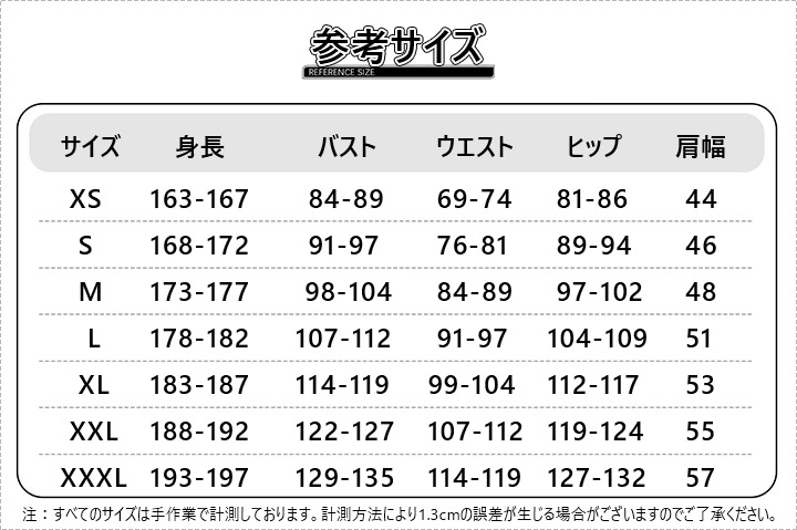 カスタマイズ寸法:性別、身長、肩幅、バスト、ウエスト、ヒップ