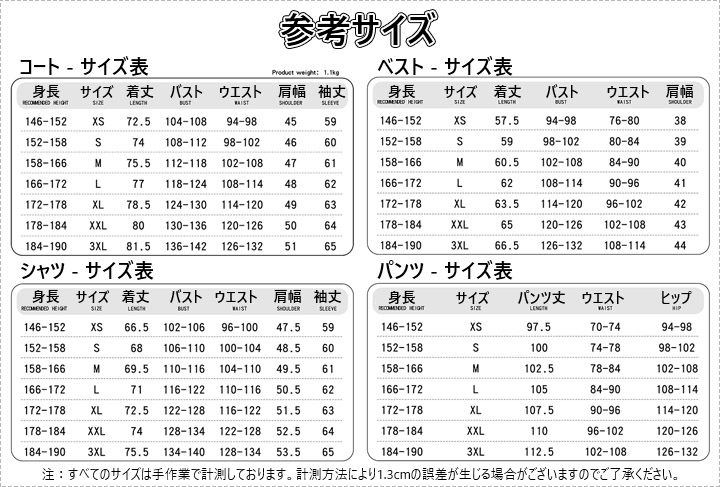 カスタマイズ寸法:性別、身長、肩幅、バスト、ウエスト、ヒップ
